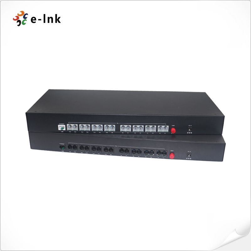 E-liên kết 16 kênh POTS (Hệ thống điện thoại cũ đơn giản) đường dây điện thoại qua bộ chuyển đổi / mở rộng cáp quang. Bộ chuyển đổi thoại qua cáp quang này sử dụng đầu nối mô-đun RJ-11C cho mỗi kết nối cặp đồng. Loại thiết bị FXO kết nối với đường dây điện thoại (PSTN) hoặc đường dây trạm PBX và có khả năng phát hiện điện áp đổ chuông và hoạt động như một chiếc điện thoại. Loại thiết bị FXS là thiết bị đối ứng và có khả năng hoạt động như PSTN và kết nối với một thiết bị điện thoại.